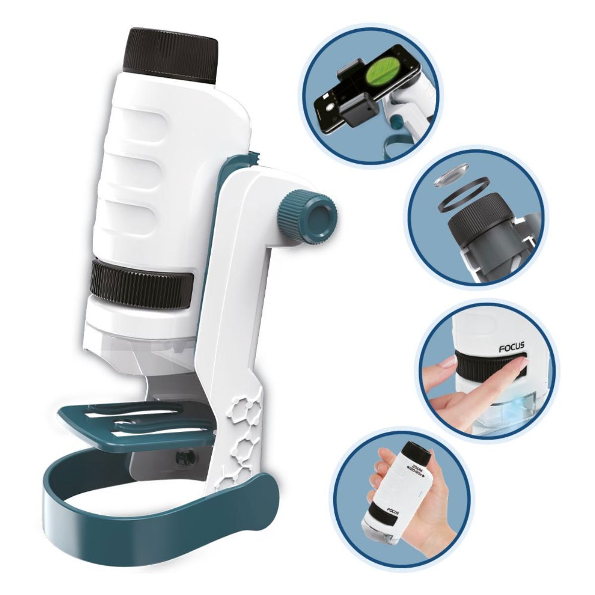Com um tamanho compacto, mas com todas as funcionalidades de um microscópio de tamanho normal, este brinquedo transforma qualquer lugar em um laboratório científico. Com suporte para smartphone, ajuste de foco e lente de alta precisão!