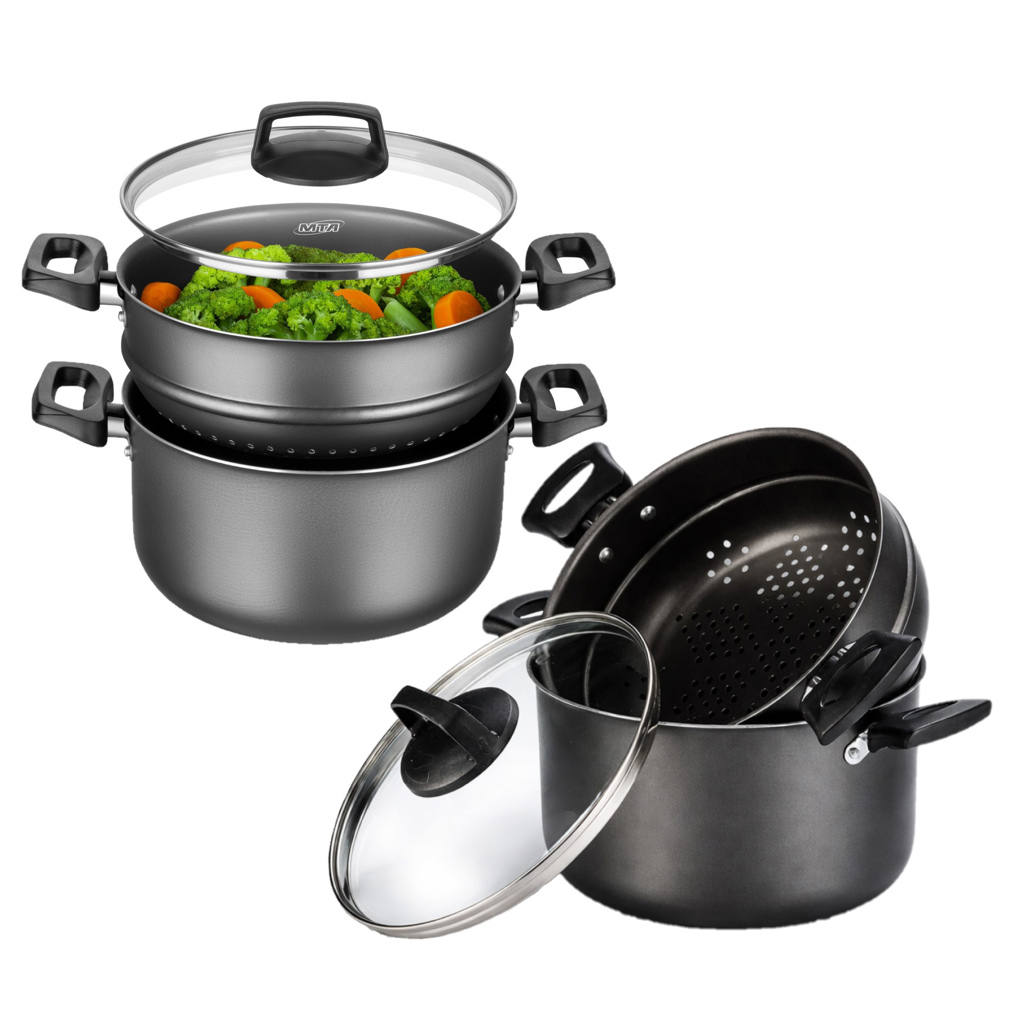 • Função 4 em 1: cozivapor, cuscuzeira, caçarola e escorredor de massas